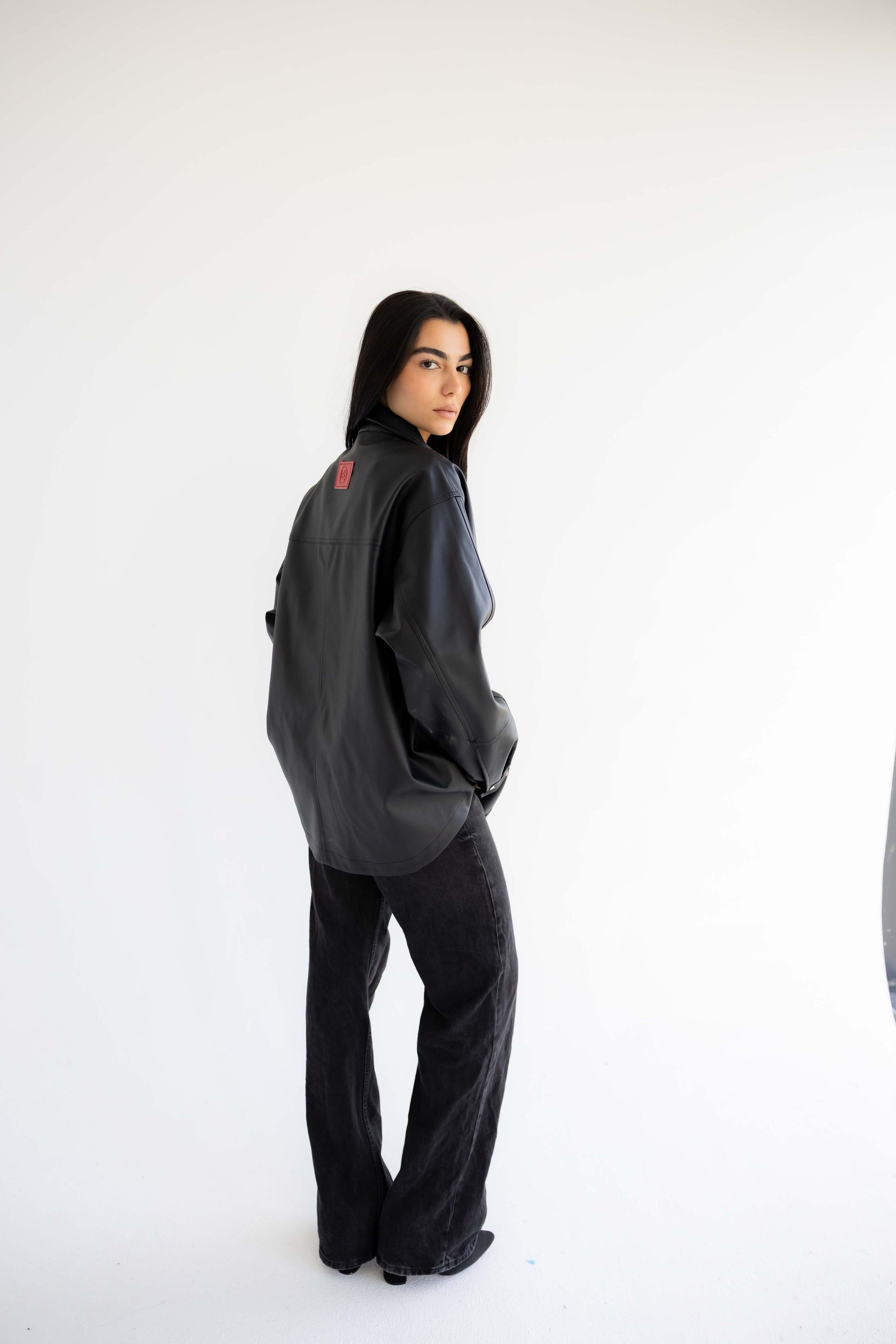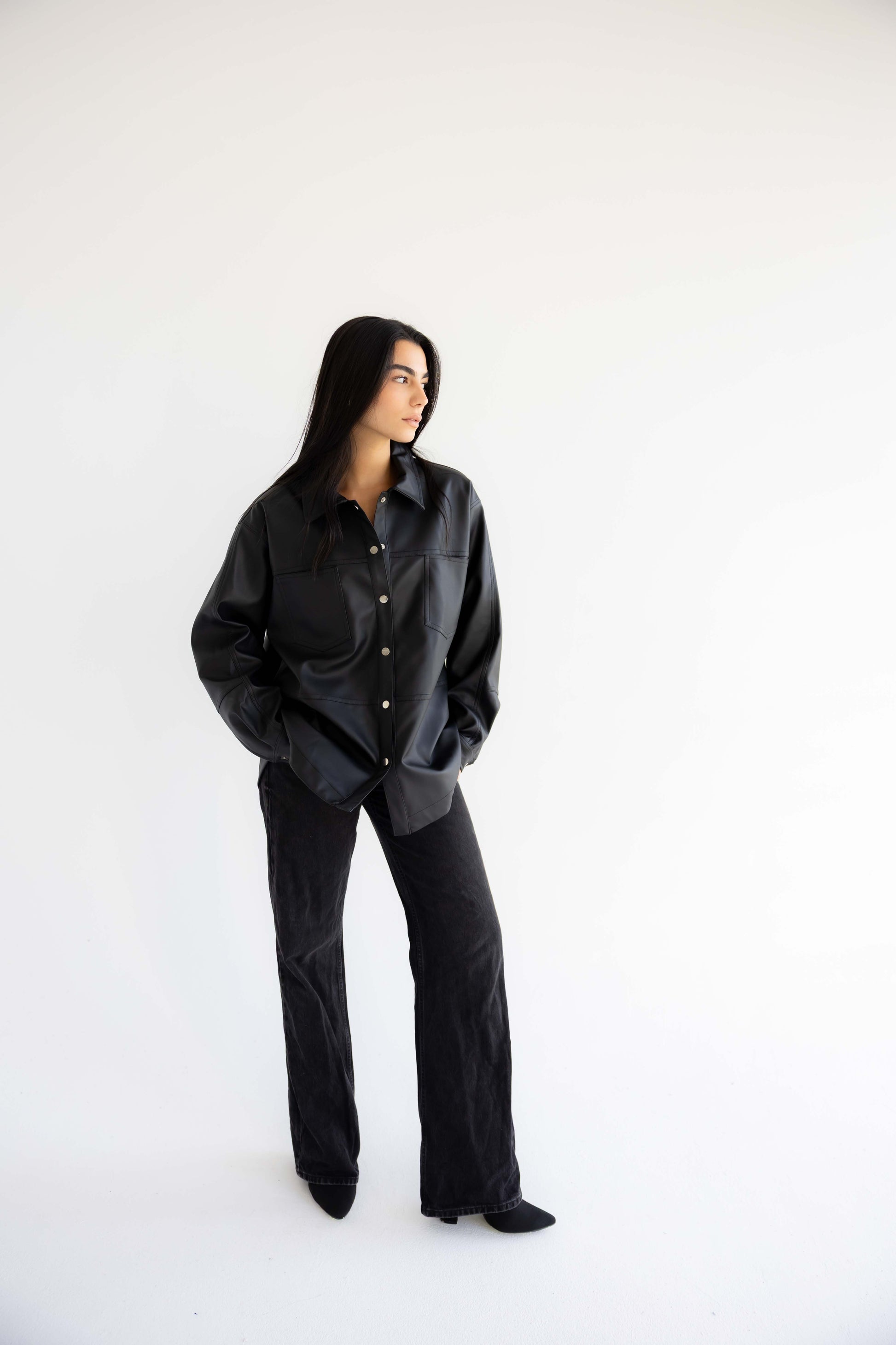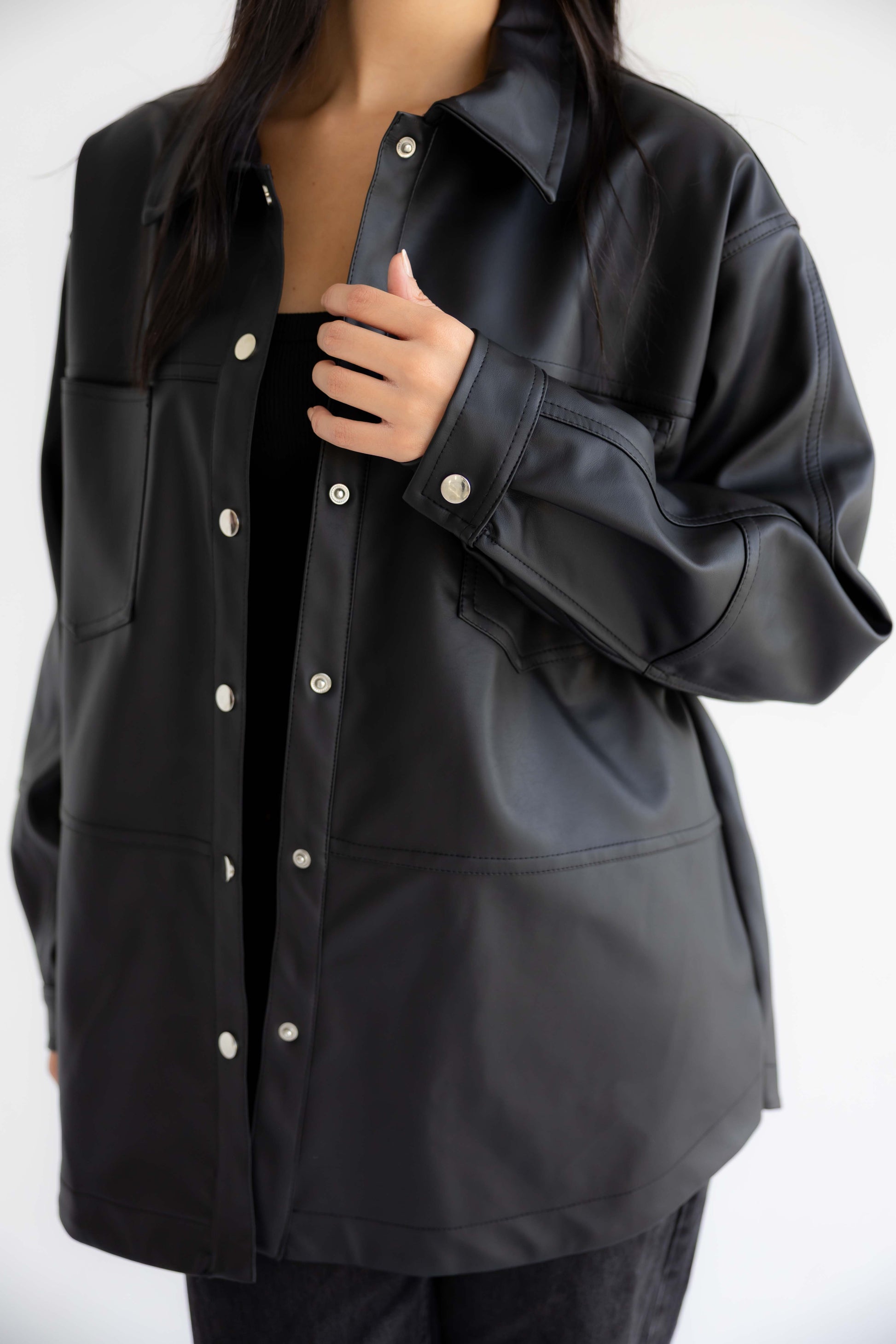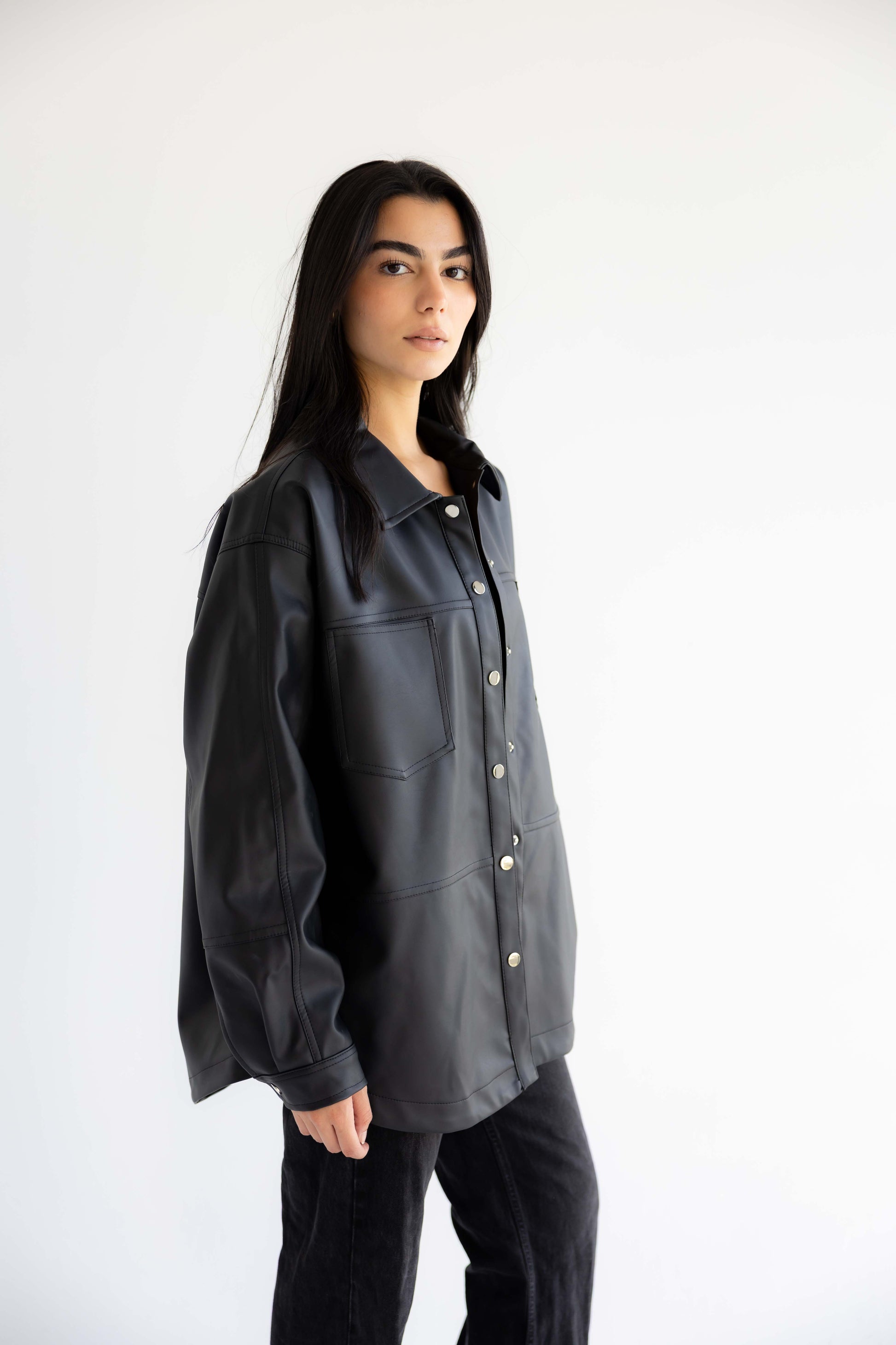 A soft-touch faux leather shirt with a smooth, premium finish. Designed in a relaxed free-size fit, giving you comfort and an effortlessly chic look. Features metal buttons, front pockets, and a clean silhouette that elevates any outfit.