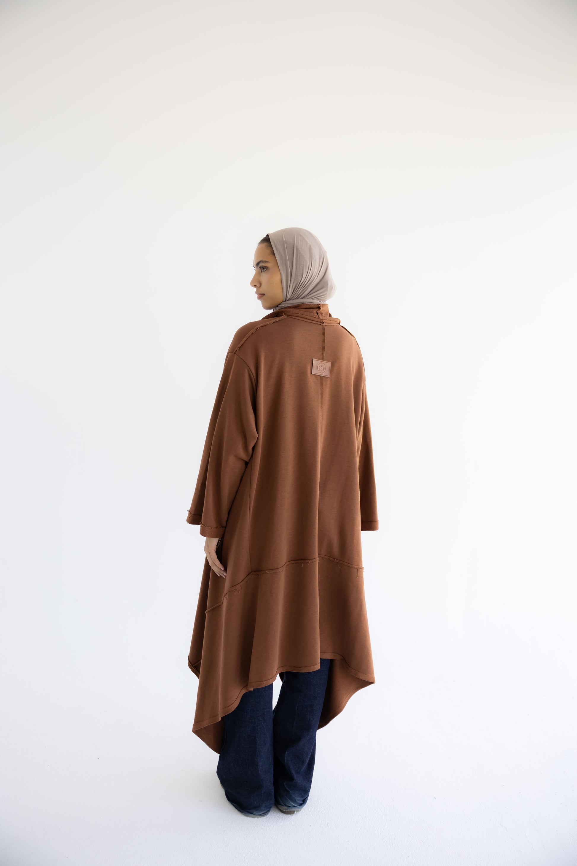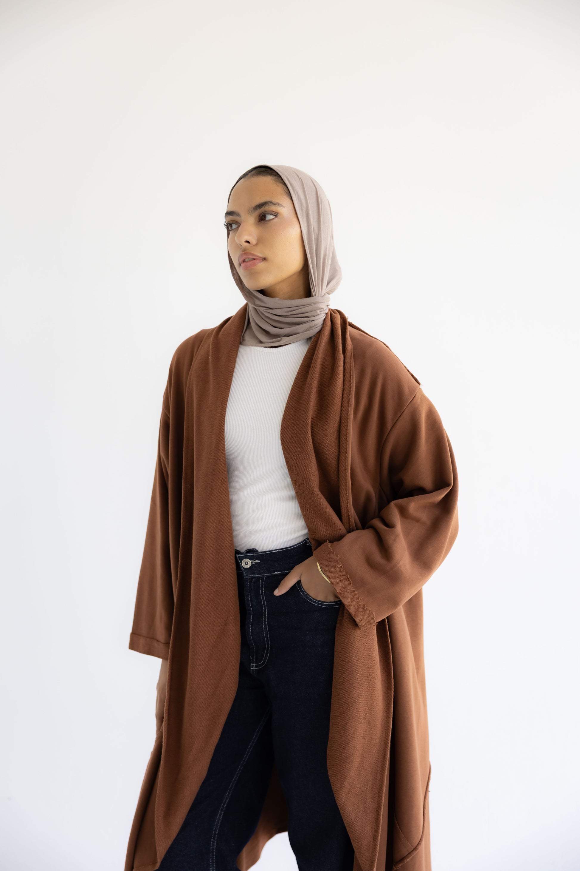 A practical and elegant long cardigan crafted from soft cotton fabric with a towel-like inner texture for warmth and comfort. Features a relaxed fit, wide sleeves, and two functional side pockets. Available in Olive and Rust Brown, one size fits up to 110 kg.