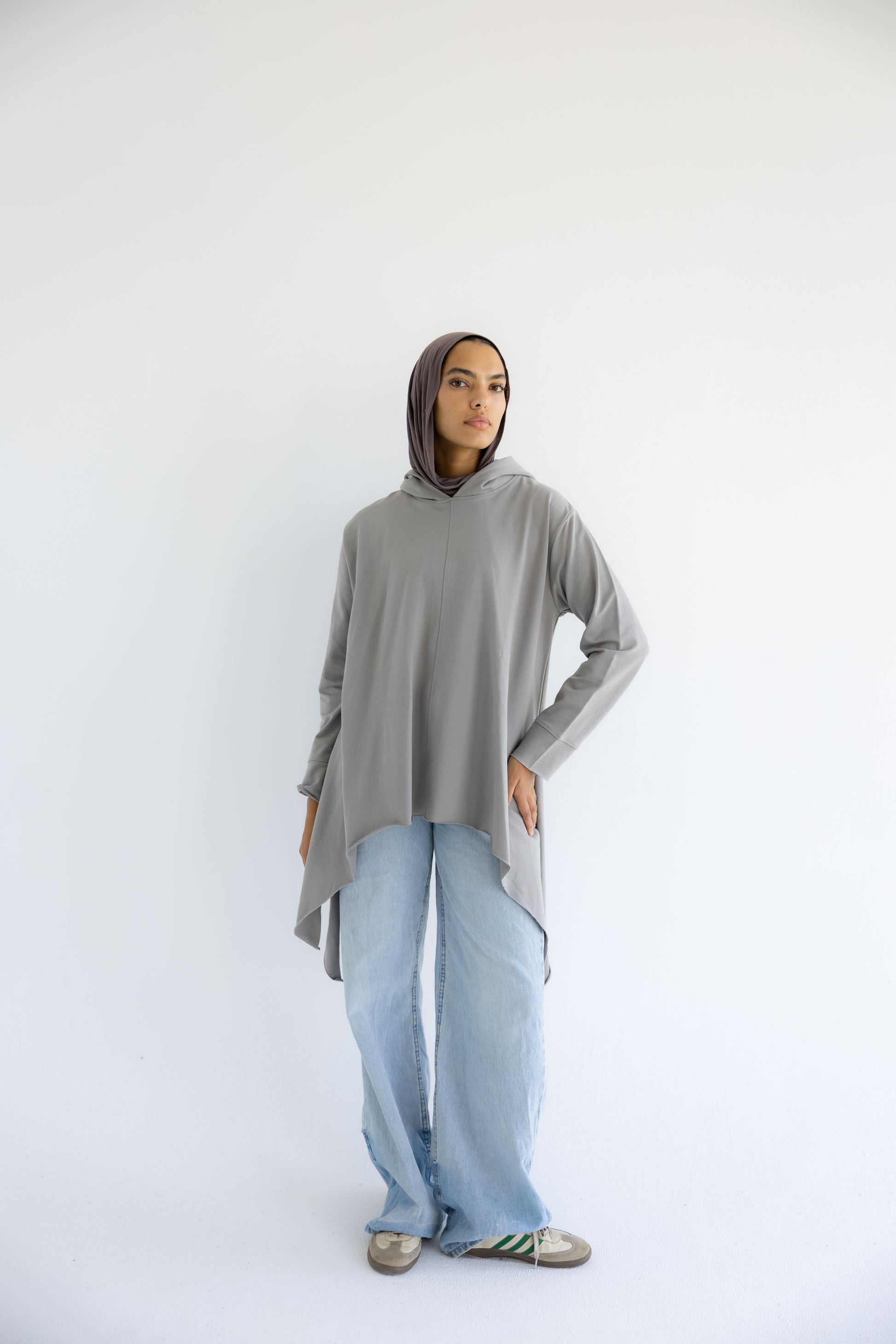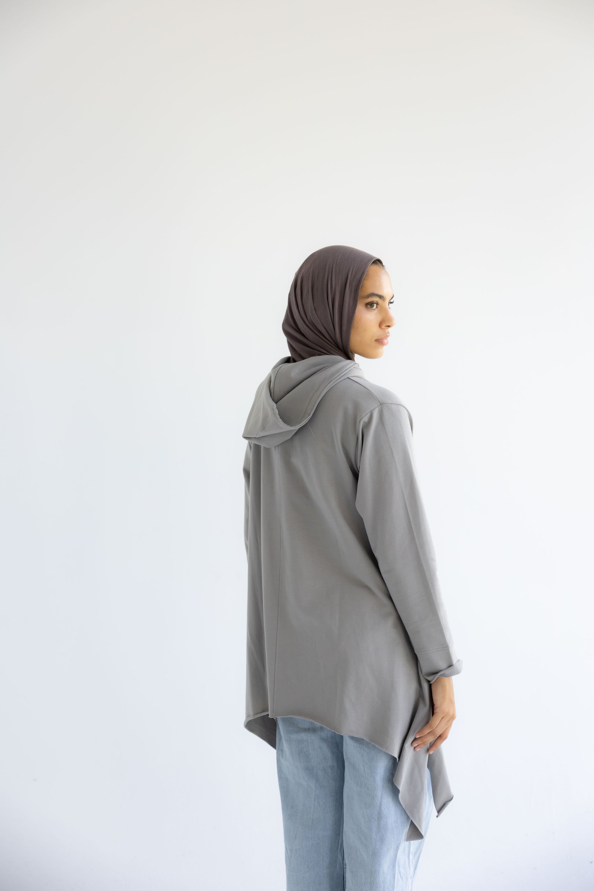 Features a hood, small side slits, and a unique asymmetric cut that’s longer on the sides.