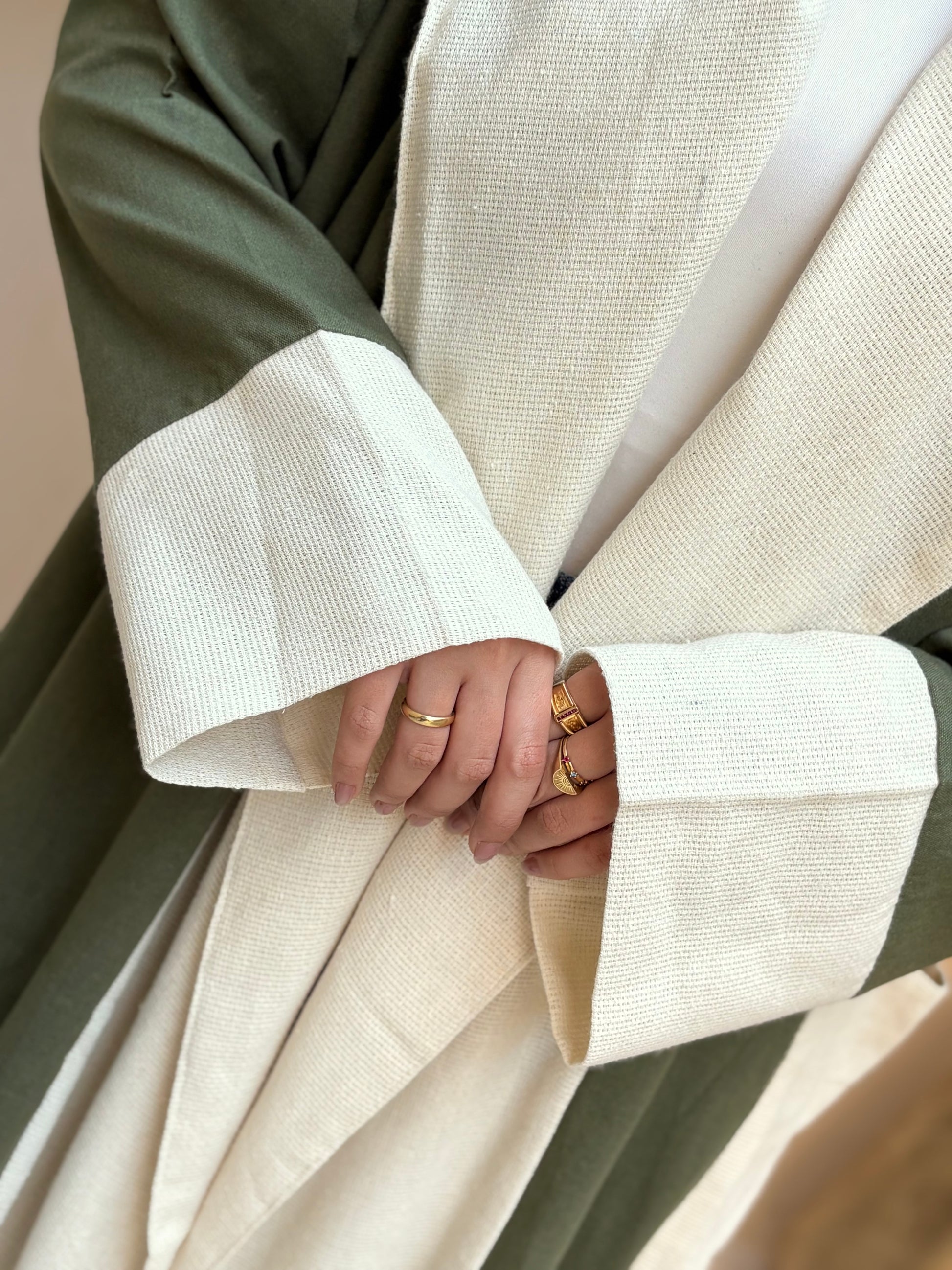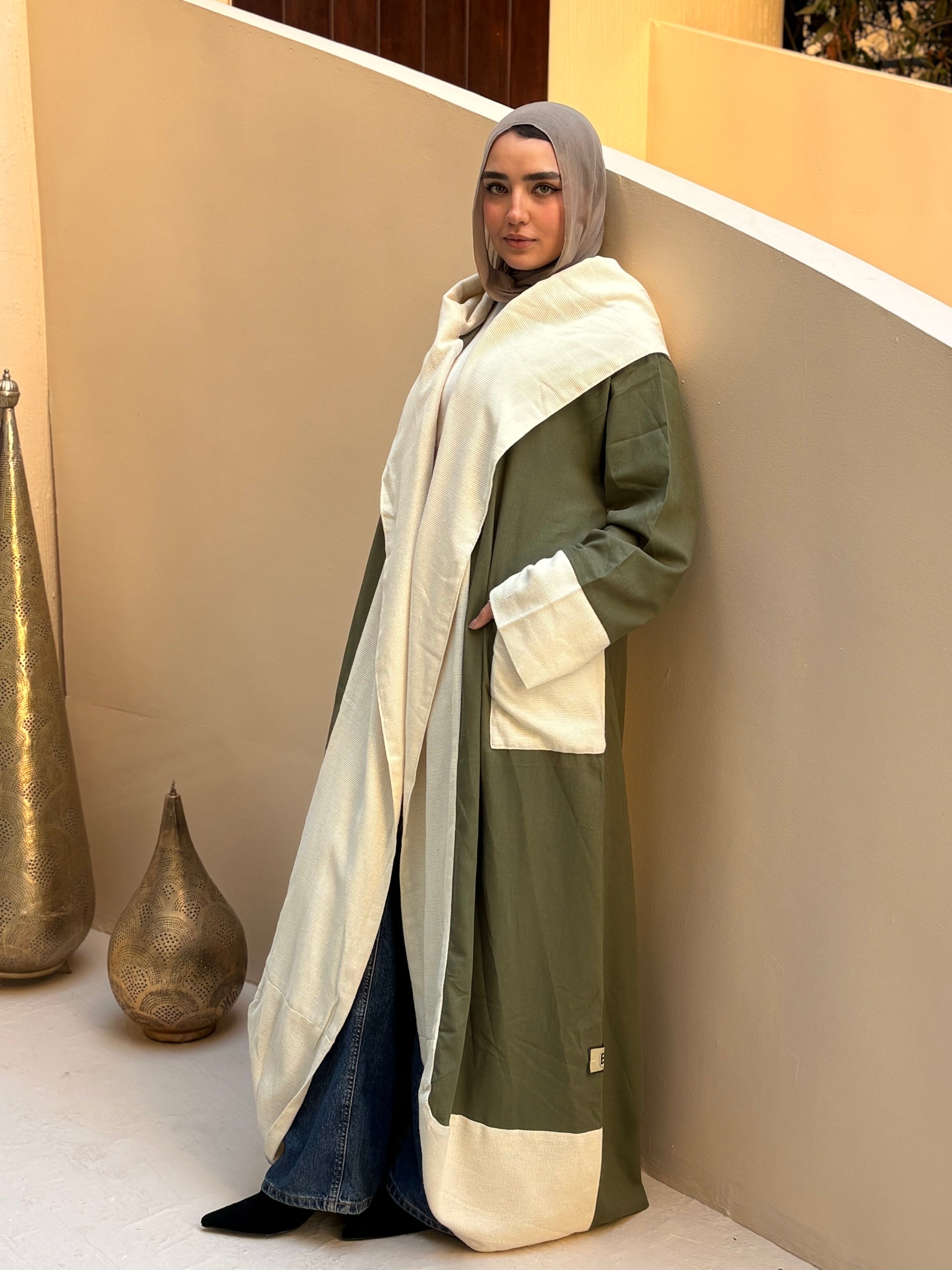 A long Ramadan-inspired cardigan made from heavy linen blended with a complementary fabric. Designed with a back hood detail and a practical pocket. Relaxed oversized fit, suitable up to 100 kg+.