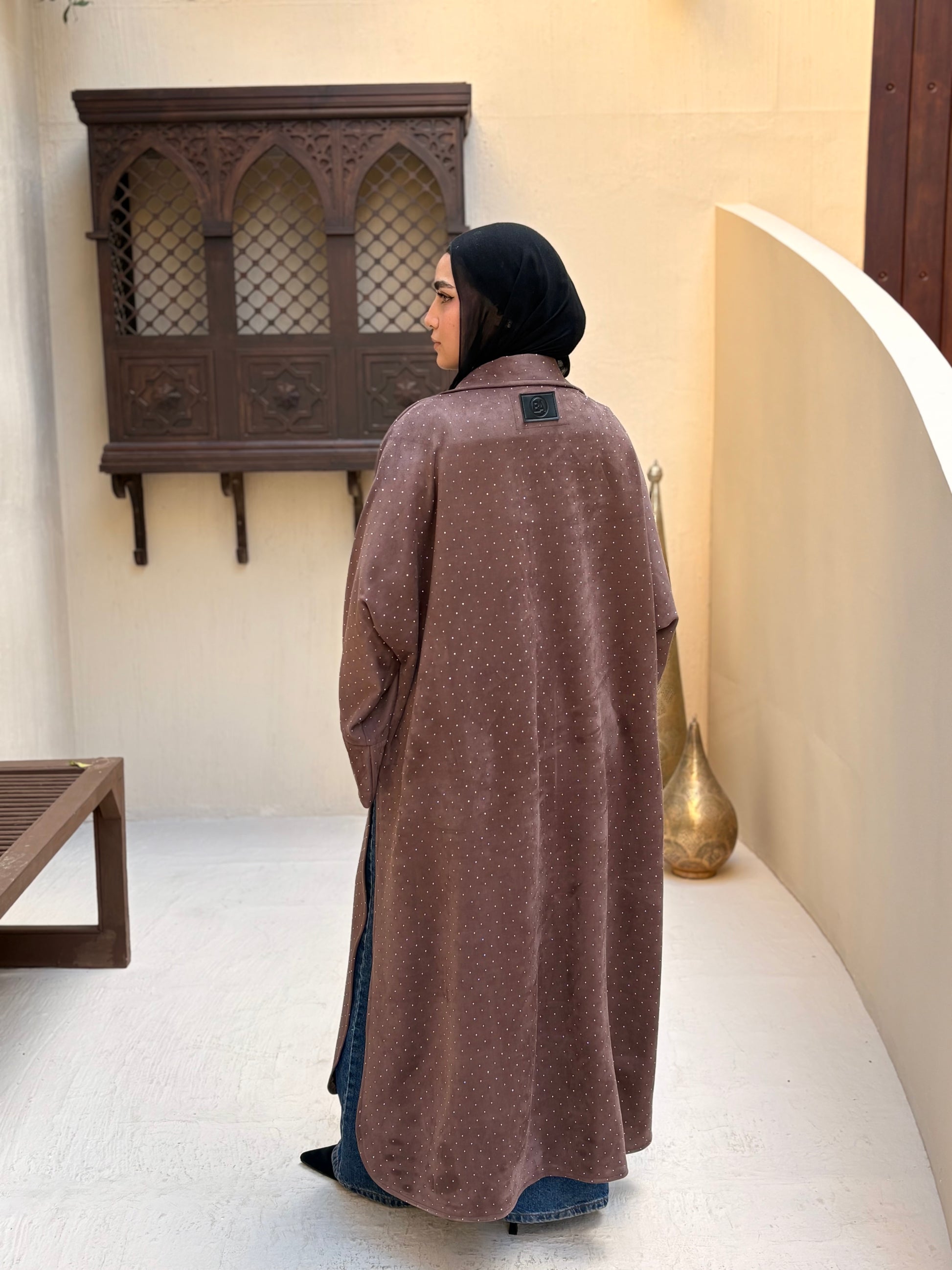 Layali Shirt Dress is crafted from soft suede fabric with delicate strass details for a subtle elegant shine.