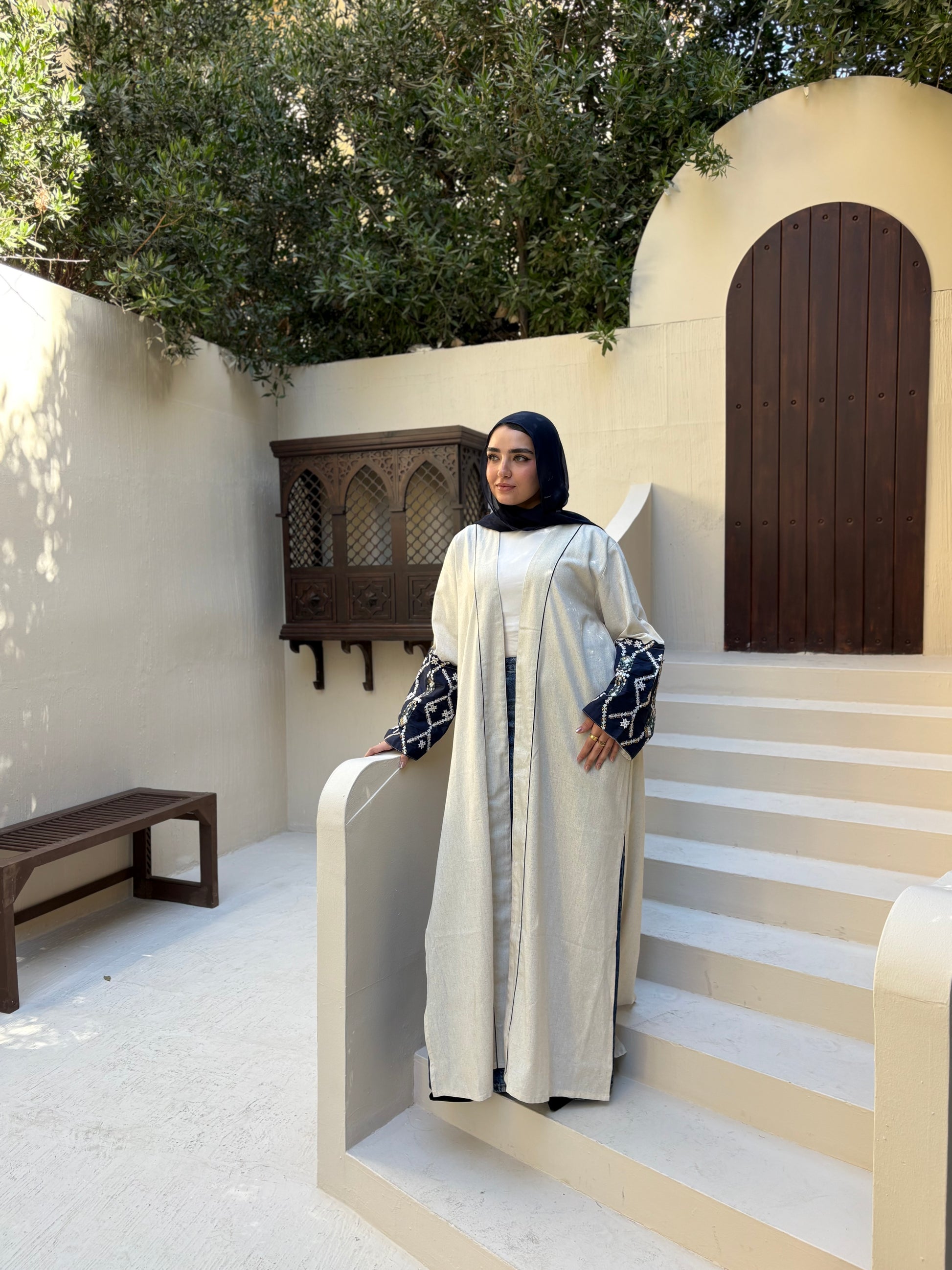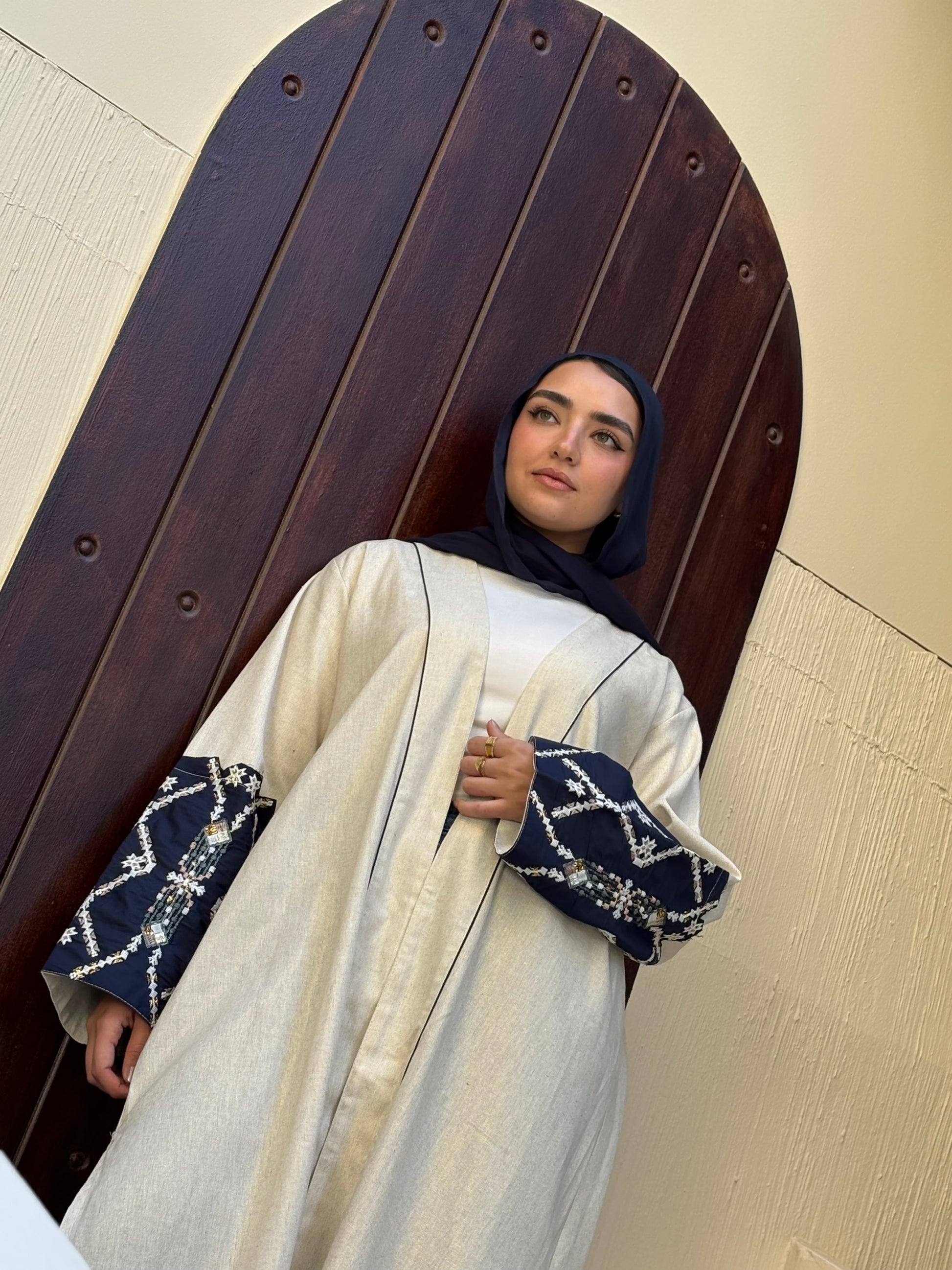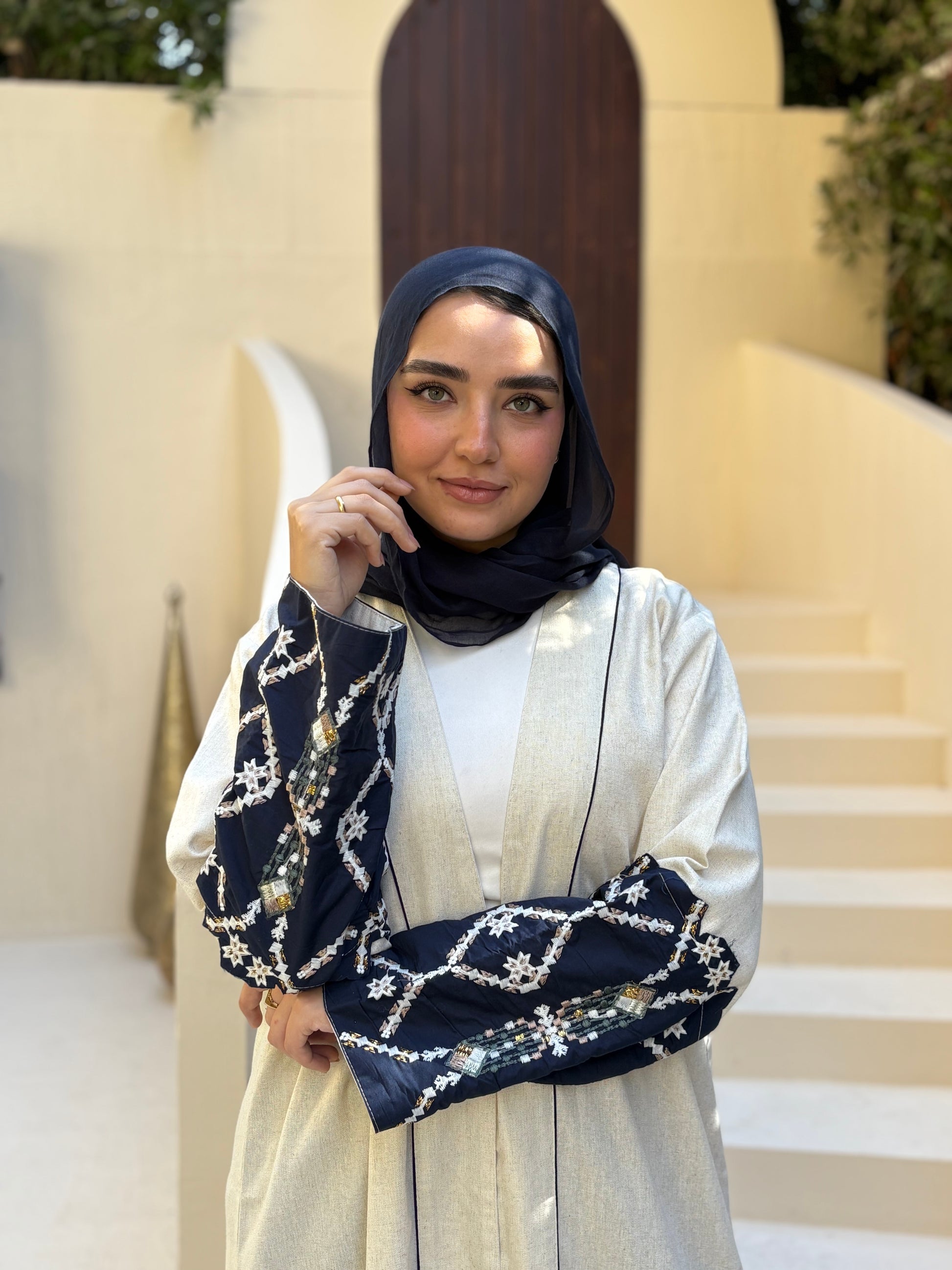 كارديجان طويل بطابع رمضاني أنيق، مصنوع من كتان تقيل بلمعة خفيفة جدًا تضيف لمسة فخامة راقية. تصميم مفتوح بقَصّة واسعة وأكمام مشغولة بتفصيل مميز مختلف. يناسب حتى 100 كجم.