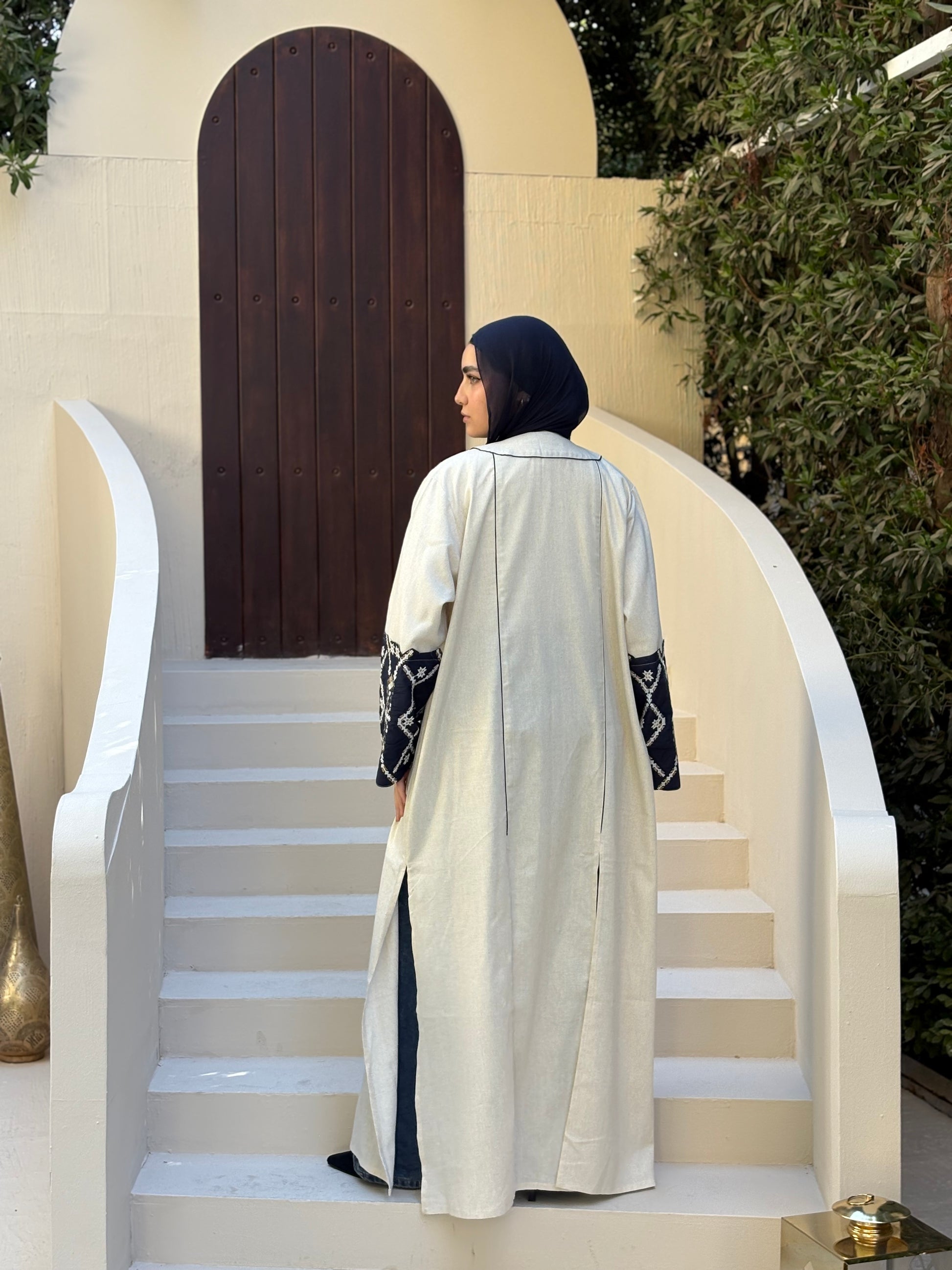 A long Ramadan-inspired cardigan crafted from heavy linen with a subtle soft sheen for an elevated look. Designed with a relaxed open silhouette and distinctive detailed sleeves. Fits up to 100 kg.