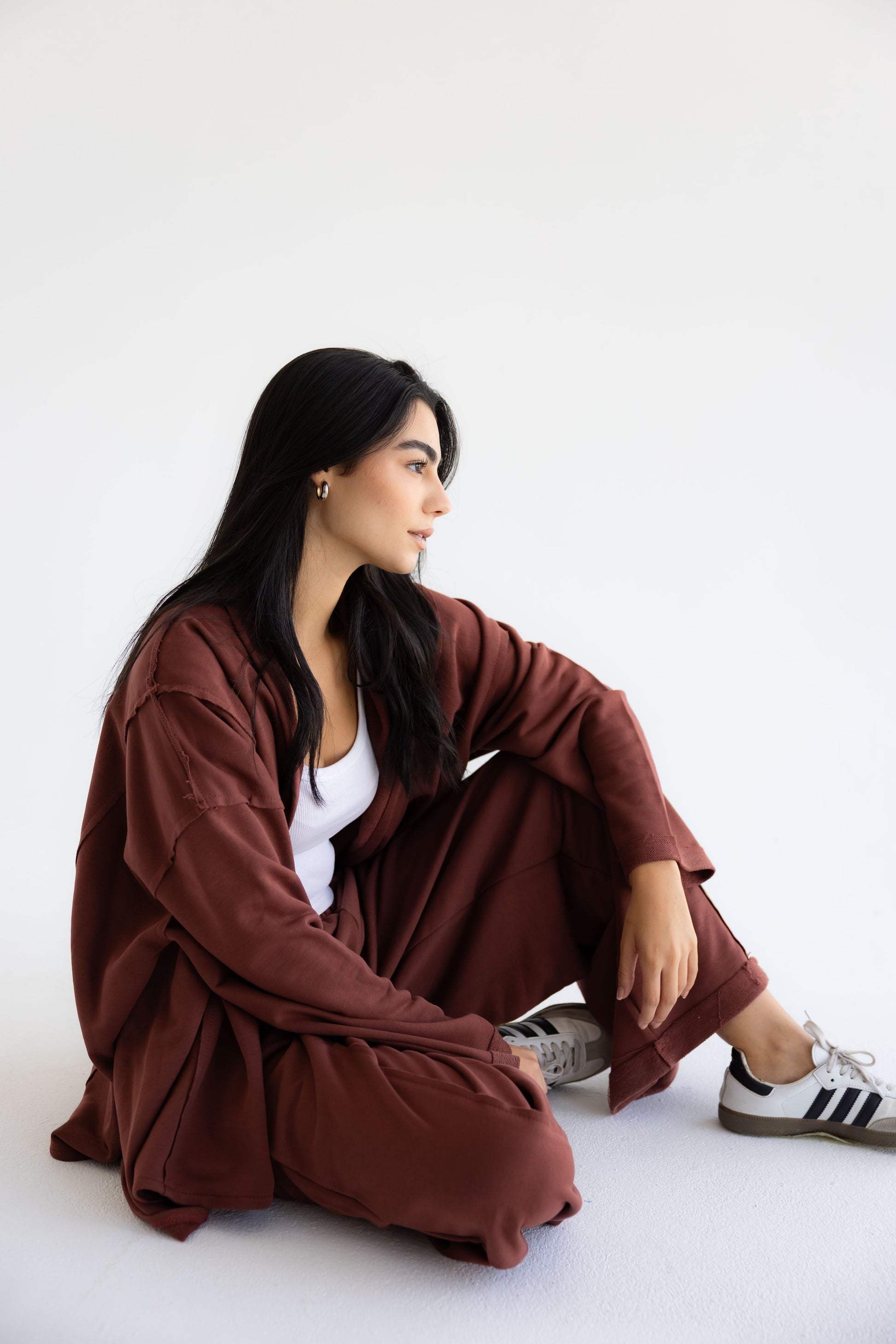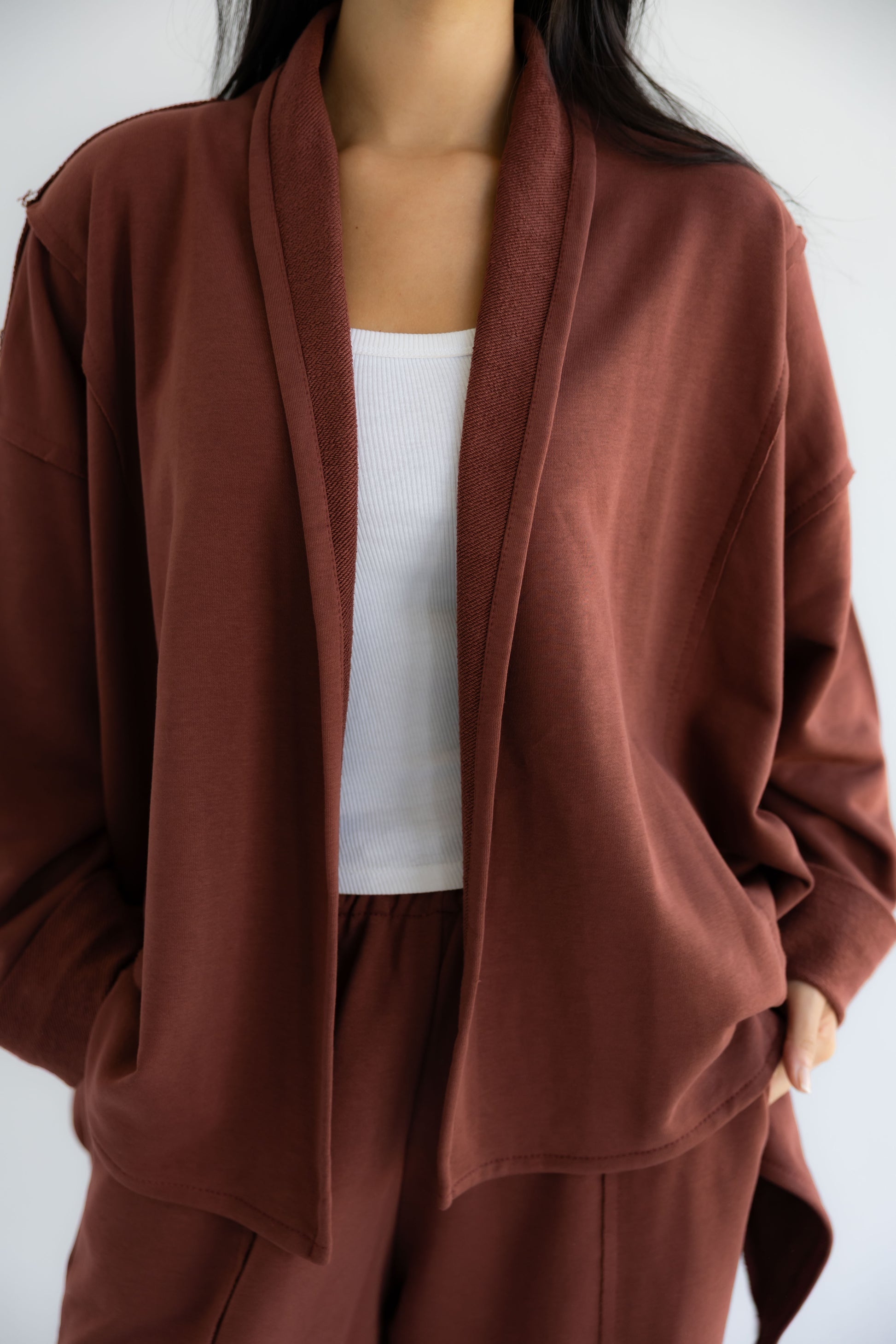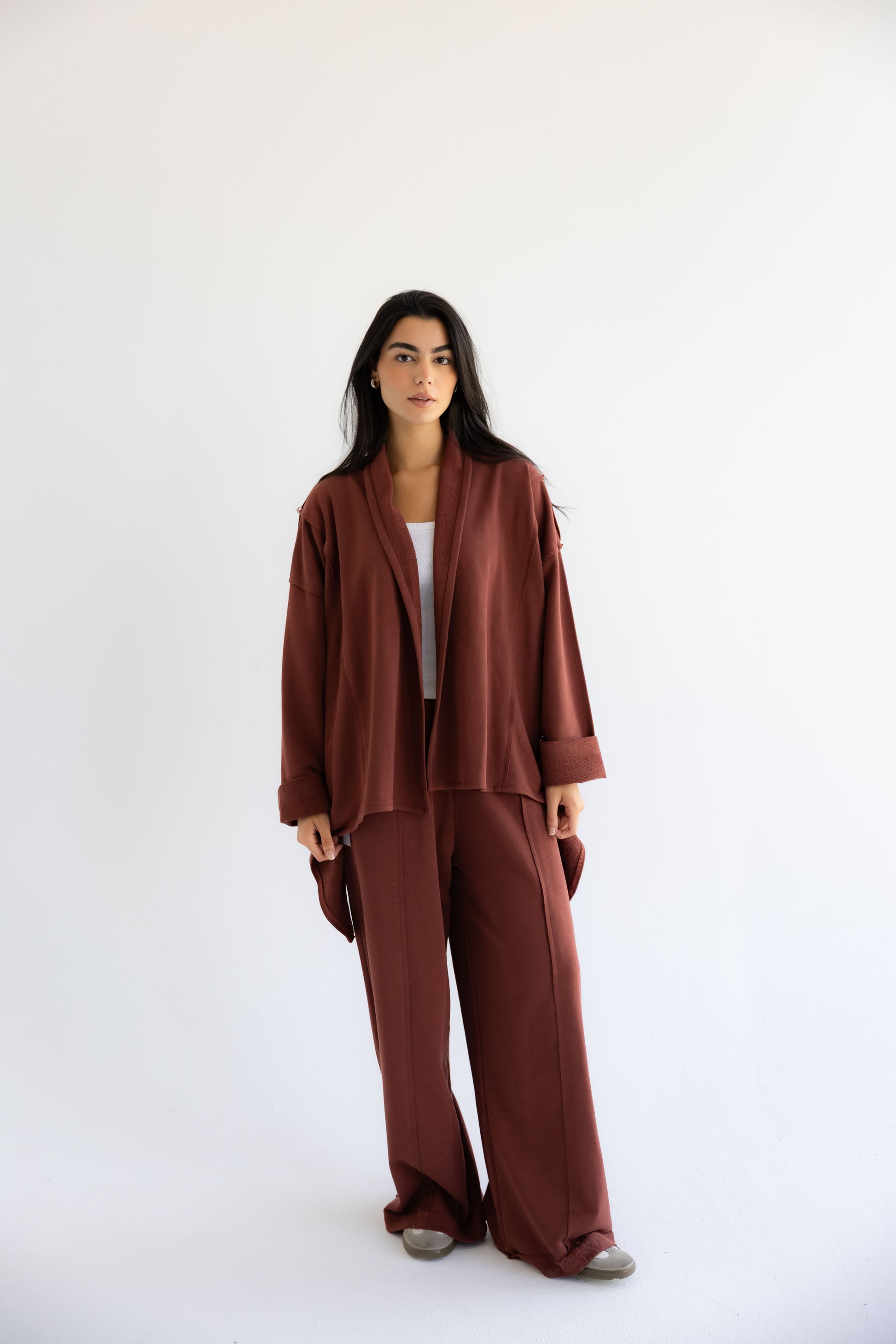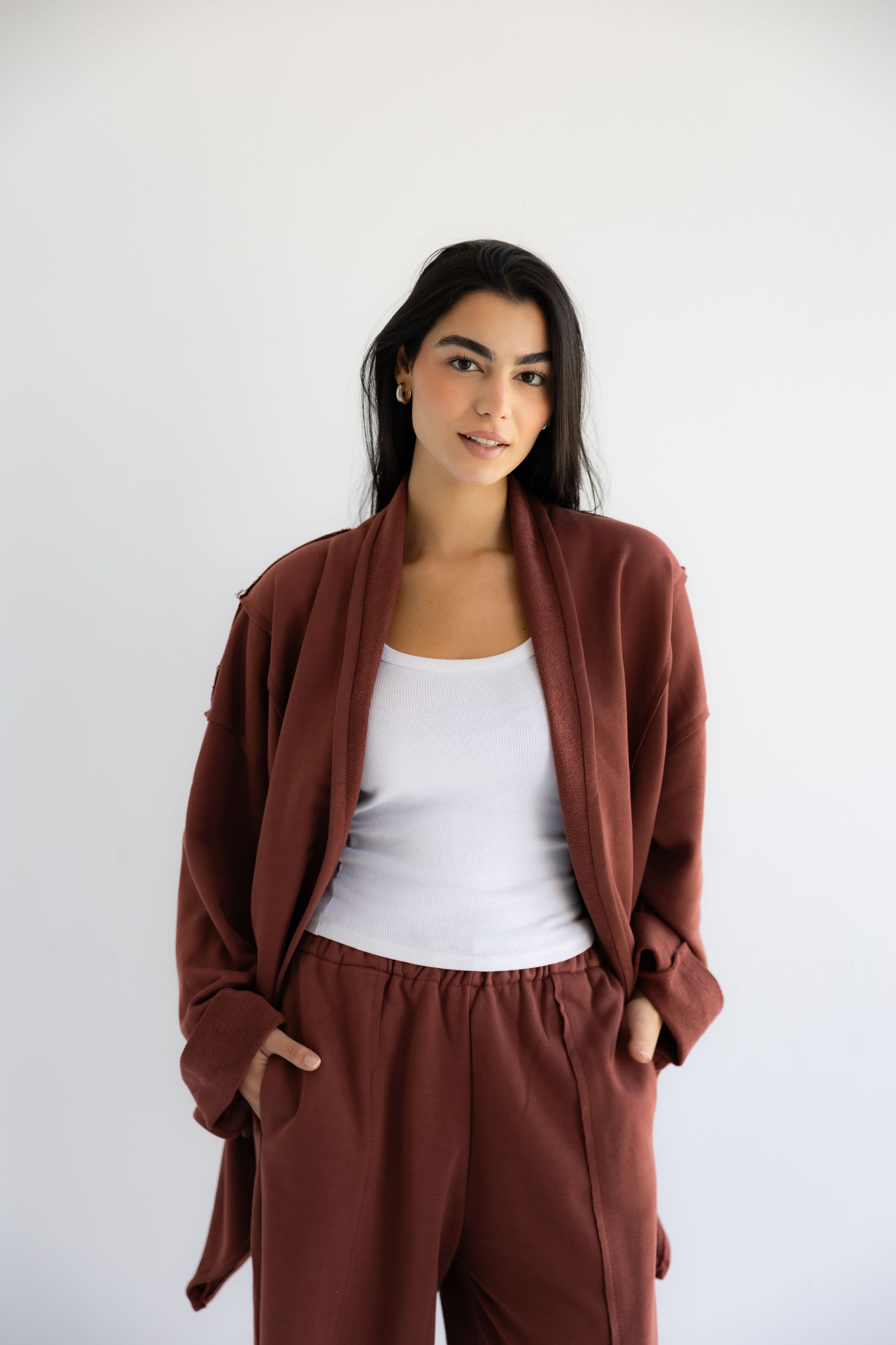 A cozy and stylish cardigan-and-pants set made from premium cotton fabric with a soft terry-like back texture for extra comfort.