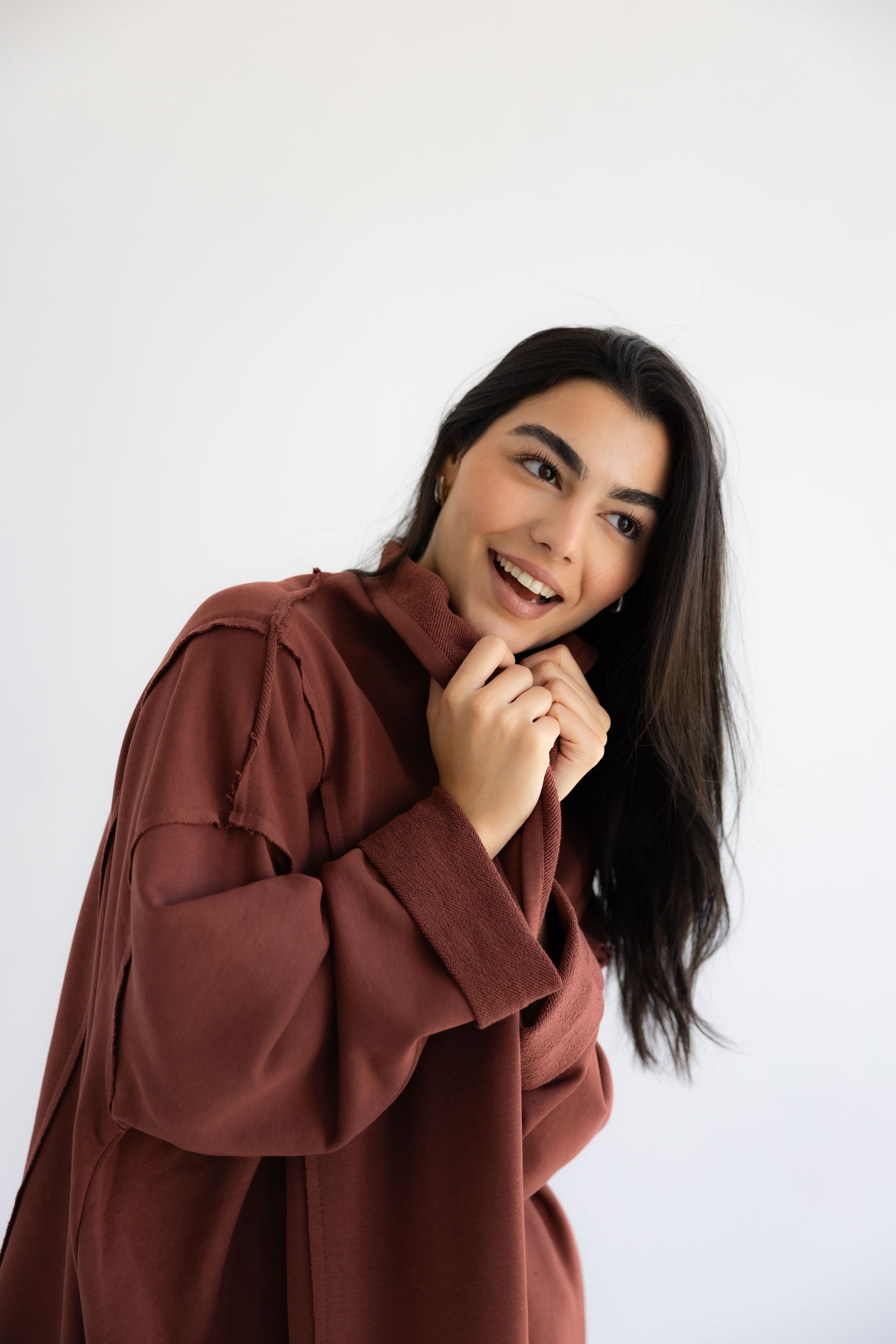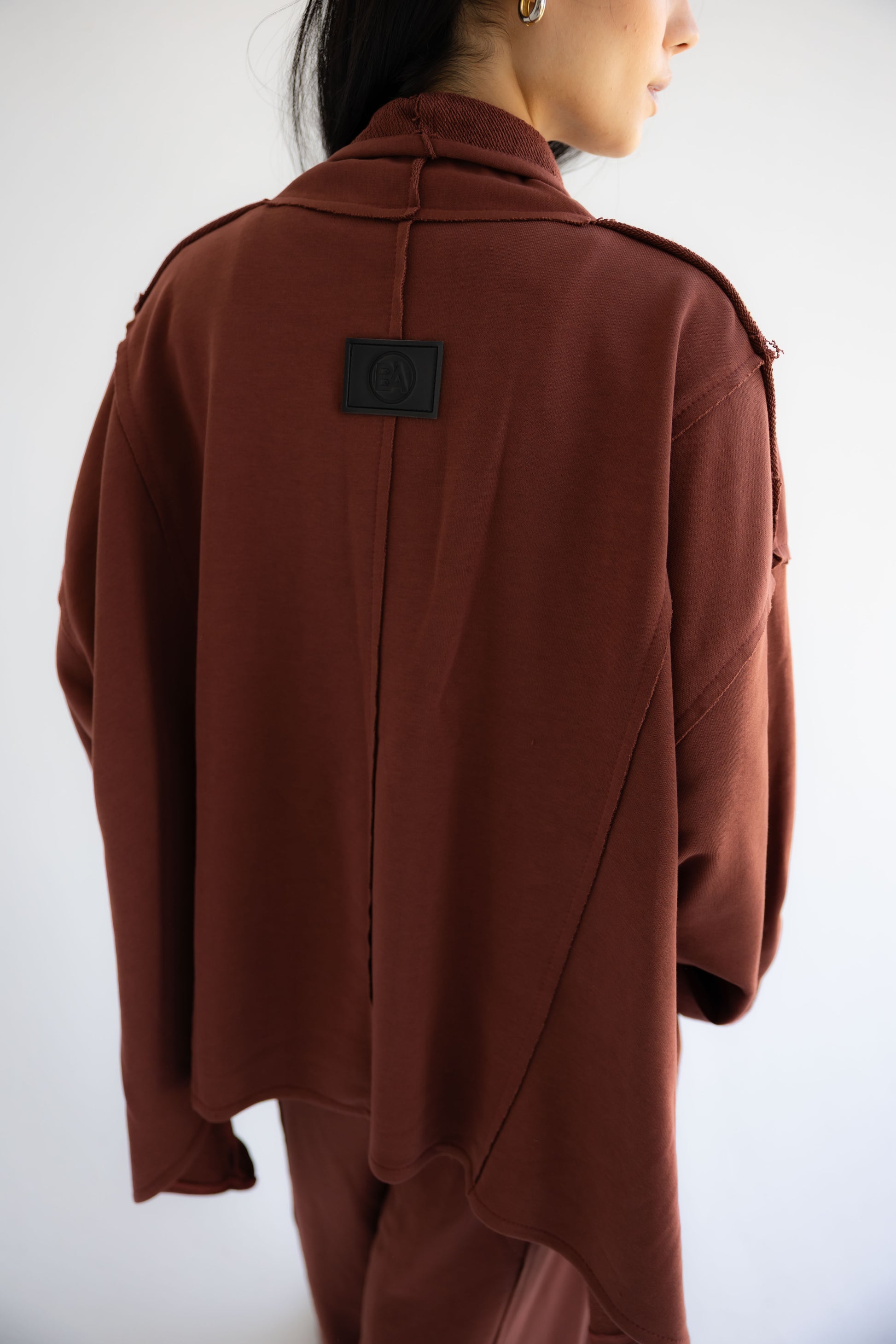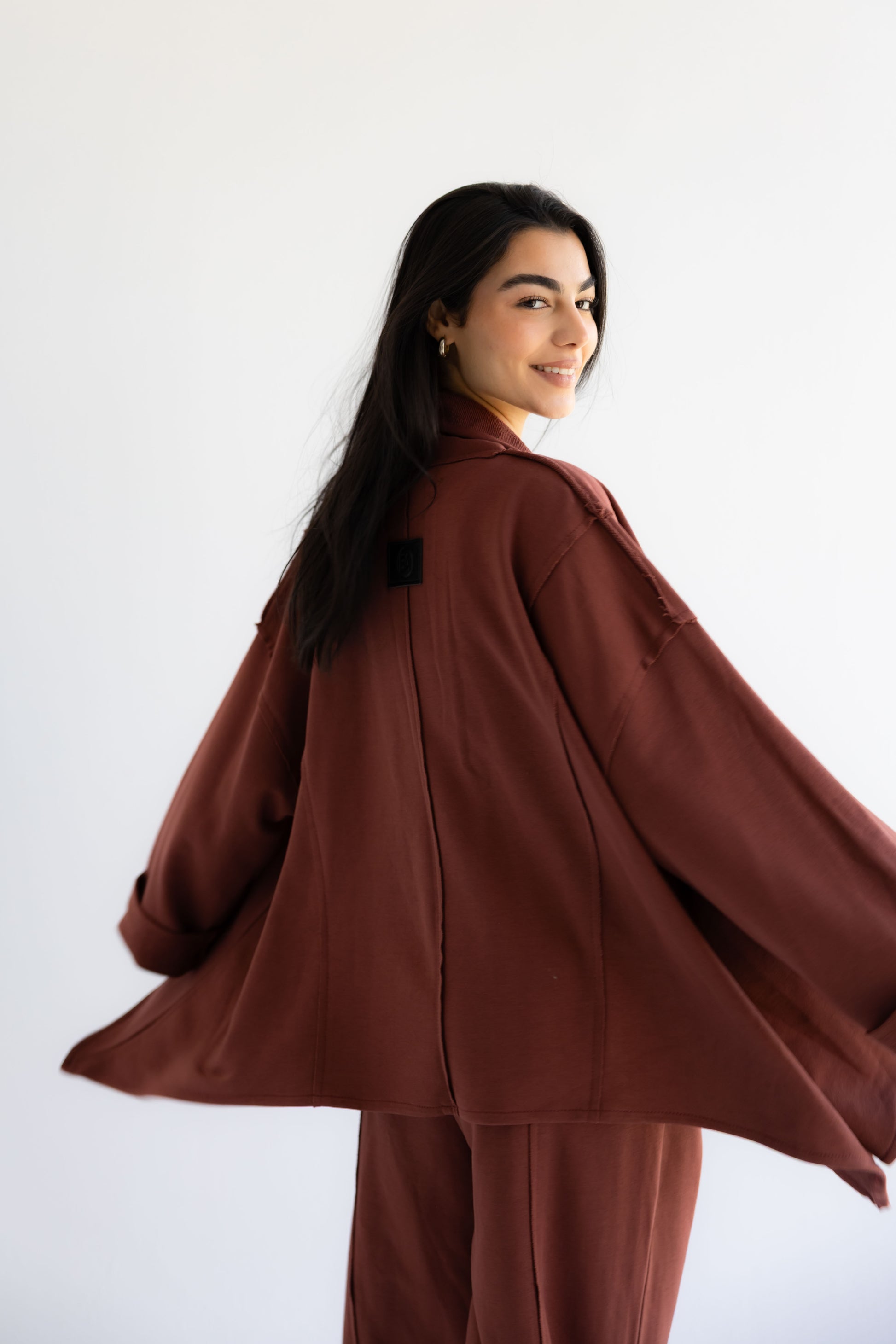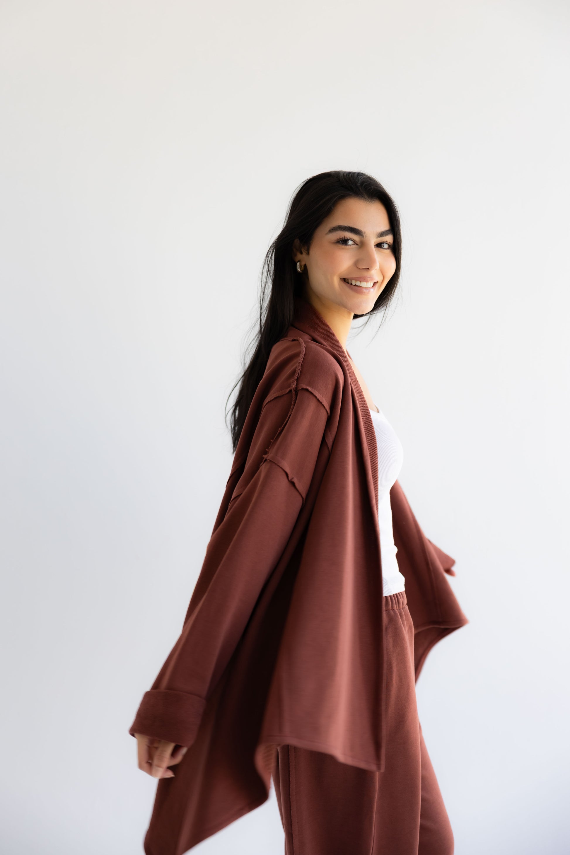 A cozy and stylish cardigan-and-pants set made from premium cotton fabric with a soft terry-like back texture for extra comfort.