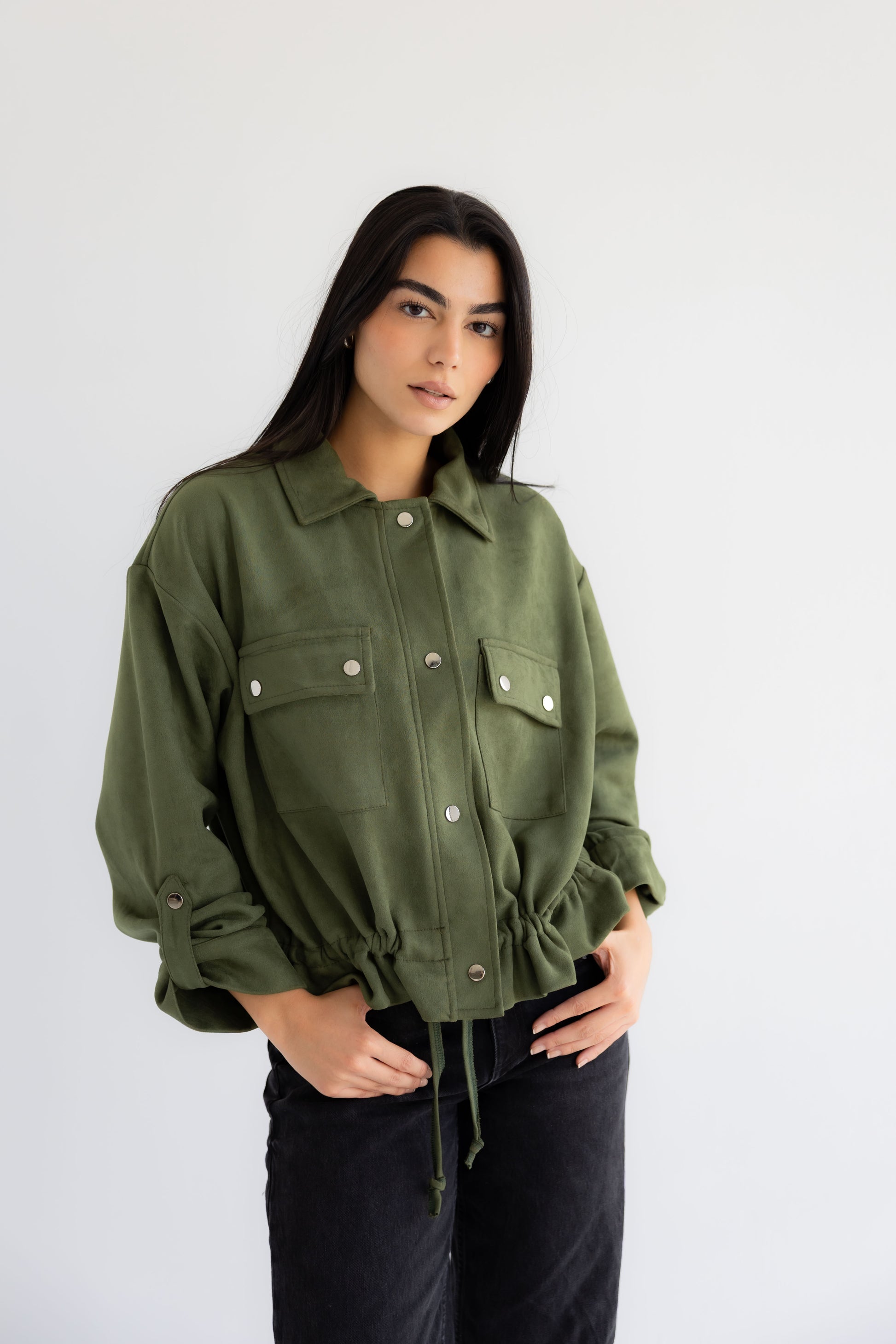 جاكيت مصنوع من خامة سويد ناعمة بتدي لمسة شيك ودافية.