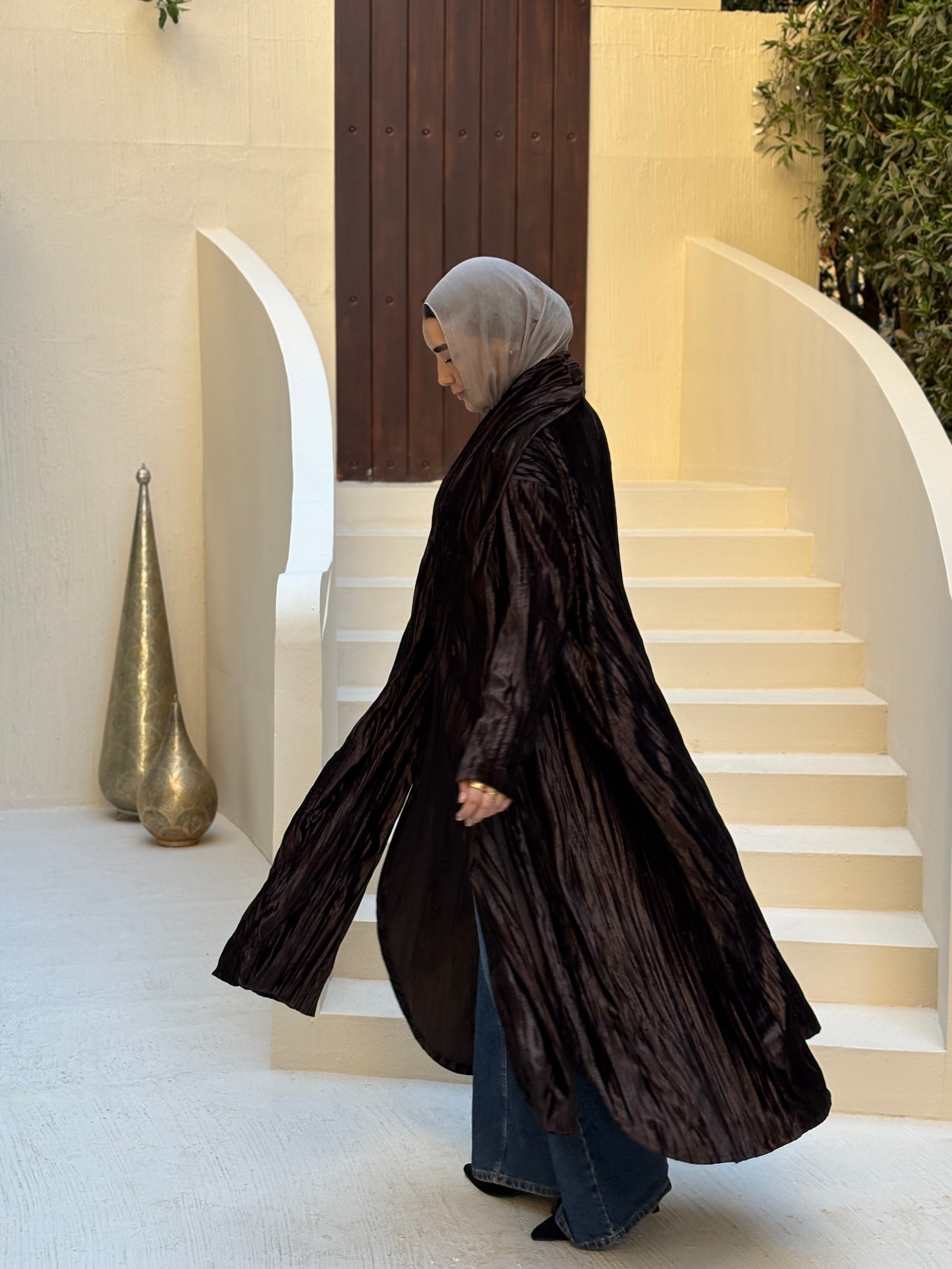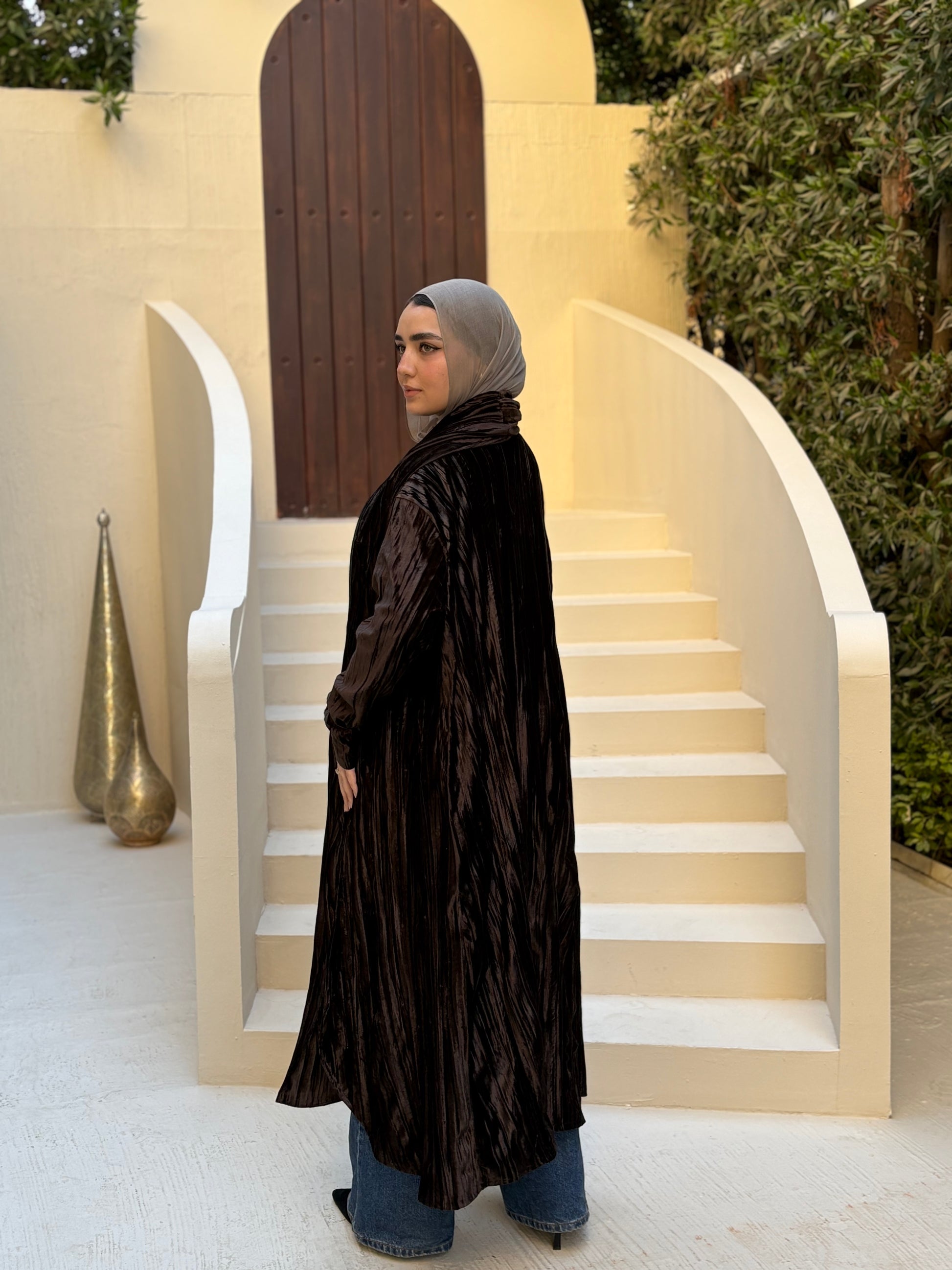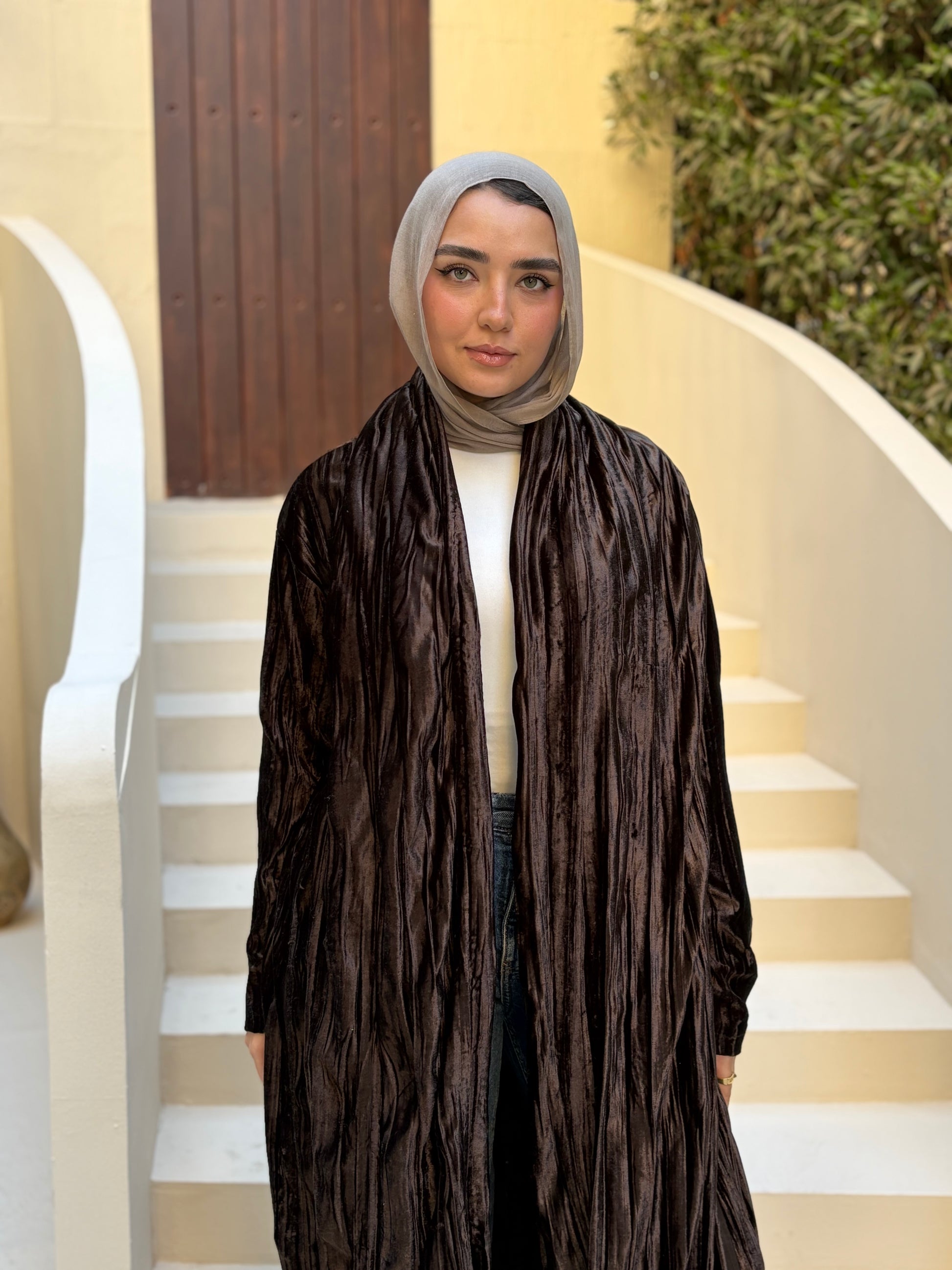 كارديجان فيلورا من قطيفة مضلعة بتصميم واسع وأنيق، يتميز بشال متصل يمكن تنسيقه بأكثر من طريقة لإطلالة متجددة.